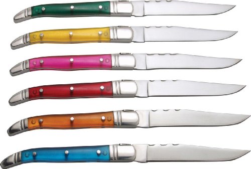 When the traditional Laguiole style is revisited to colour the very best tables Each guest has its own knife recognizable by its color Features 420 stainless steel blade ABS translucent plastic handle 6 assorted colors Each knife measures 906 inches