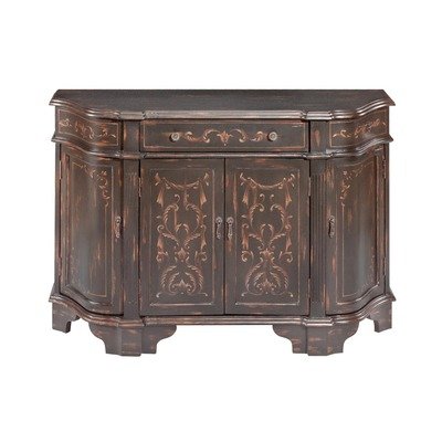 64161 Features -Storage credenza-Copper decorative pulls-Hand painted vine motif-One drawer-Two curved corner doors-Two center doors-Scalloped base ColorFinish -Antique black finish-Completely finished interior Dimensions -Overall dimensions 33 H x 48 W x 15 D Warranty -One yea