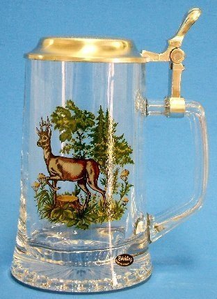 Product Specifications This high quality glass beer mug features a deer in the forest The mug has a pewter lid This new 04 Liter 16 ounce glass is approximately 65 inches tall Made in Germany