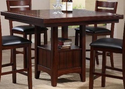 This dining table features a dark cherry finish counter height and a box pedestal base It is ideal for furnishing your dining room or kitchen We also have matching side chairs available on our other listings Dark Cherry Finish Box Pedestal Base Square Table Top 48 X 48 X 36H Some assembly re